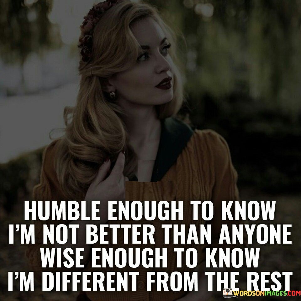 The quote "Humble enough to know I'm not better than anyone, wise enough to know I'm different from the rest" encapsulates a balanced and enlightened perspective on self-awareness and humility. It highlights the importance of recognizing one's intrinsic worth while avoiding the trap of arrogance or superiority over others.