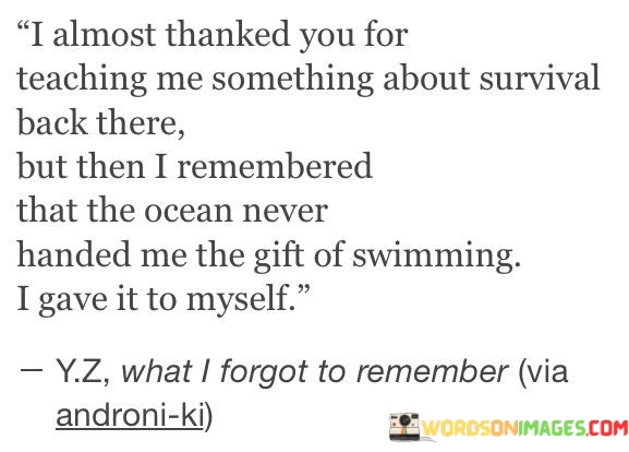 In this quote, the speaker expresses a sense of gratitude towards someone for teaching them a valuable lesson about survival. However, they quickly realize that the credit for their ability to survive doesn't entirely belong to the person they were about to thank. They draw a metaphorical comparison with the ocean, implying that just as the ocean didn't provide the gift of swimming, they didn't solely rely on external sources. Instead, they took the initiative and effort to acquire the skill themselves, highlighting the importance of self-reliance and personal agency in overcoming challenges.