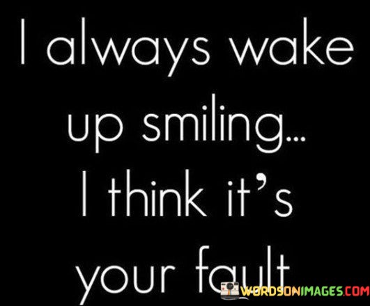 The quote humorously attributes morning happiness to someone else. "Wake up smiling" conveys a positive start to the day. "Your fault" playfully implies that someone's presence or influence is responsible for the cheerful mornings, suggesting their role in bringing joy and happiness.