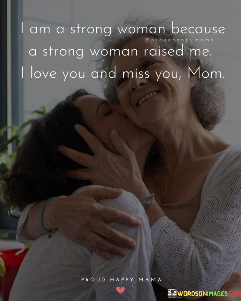 The statement reflects the deep gratitude and love for the strong woman who raised the speaker, likely their mother. I am a strong woman because a strong woman raised me. I love you and miss you, Mom."