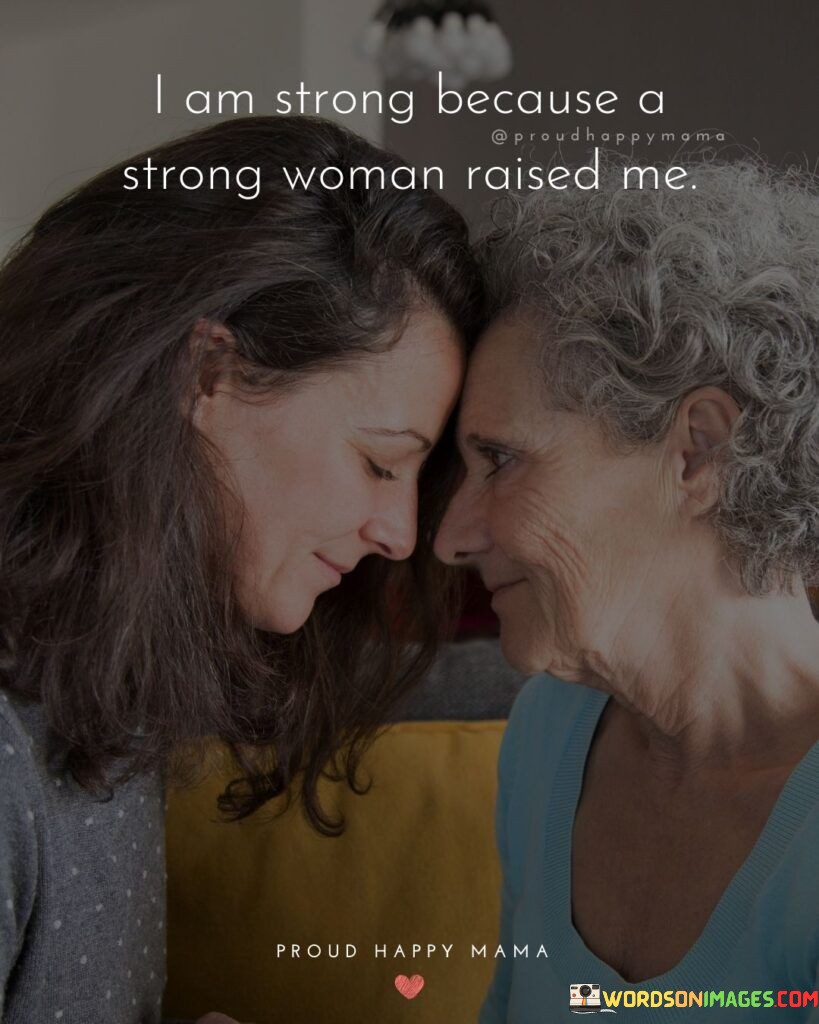 This statement acknowledges the profound impact of having a strong woman as a role model during upbringing. It attributes the speaker's strength and resilience to the influence of this strong female figure.