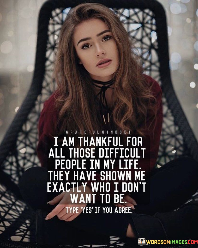 This sentiment expresses gratitude for challenging experiences with difficult people. "I am thankful for all those difficult people in my life; they have shown me exactly who I don't want to be" acknowledges the lessons gained from challenging interactions and personal growth. It underscores the transformative power of using adversity to shape one's values and character.