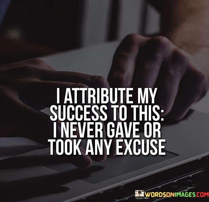 The quote attributes success to a resolute mindset. The first paragraph highlights the individual's key to success: an unwavering commitment to avoiding excuses. This attitude underscores personal accountability and determination.