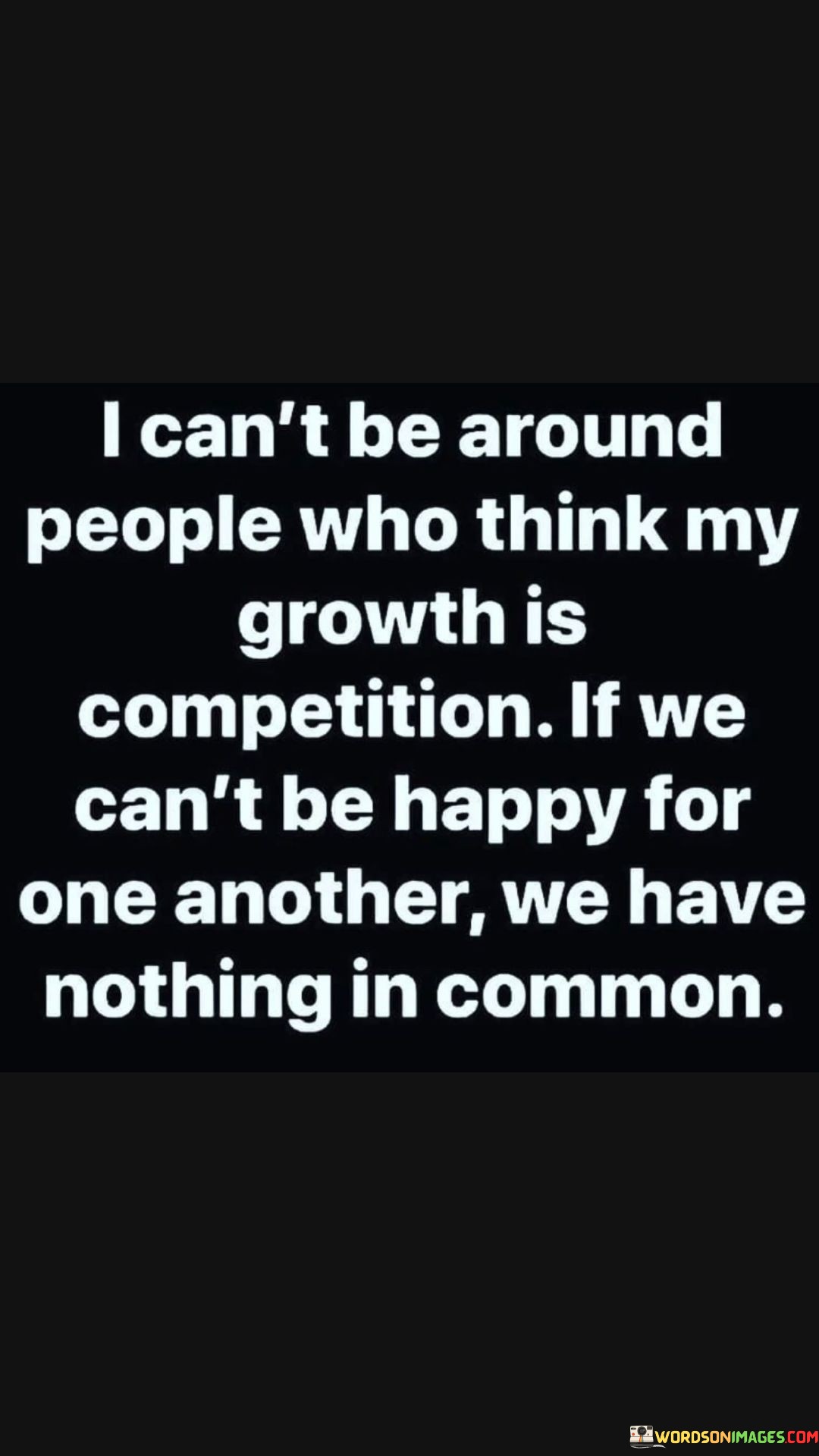 This statement sets a boundary for positive relationships. It suggests that being around individuals who view personal growth as a competition is untenable. It emphasizes the importance of mutual support and genuine happiness for one another's achievements.