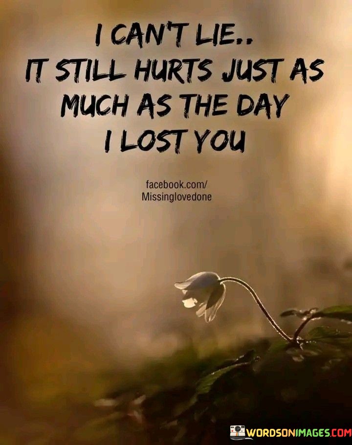 This quote conveys enduring pain and emotional honesty. The inability to lie about the hurt indicates an unchanging depth of sorrow. The mention of "the day I lost you" suggests a significant loss or breakup, highlighting that the pain remains as intense as it was on that initial day.