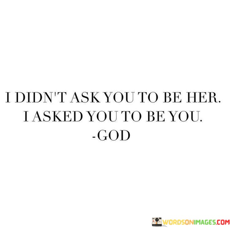 In essence, "I Didn't Ask You To Be Her, I Asked You To Be You, God" emphasizes the significance of a personal and authentic relationship with God, where individuals are encouraged to be themselves and trust that God accepts and loves them as they are.