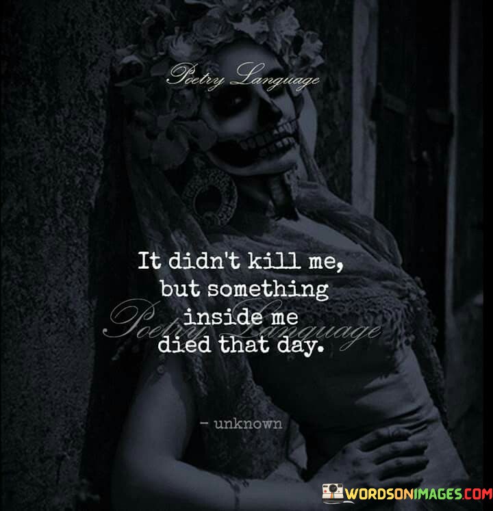 The quote conveys the lasting impact of a significant event. "Didn't kill me" implies survival. "Something inside me died" symbolizes emotional loss. The quote illustrates the enduring emotional shift caused by a traumatic or deeply affecting experience.