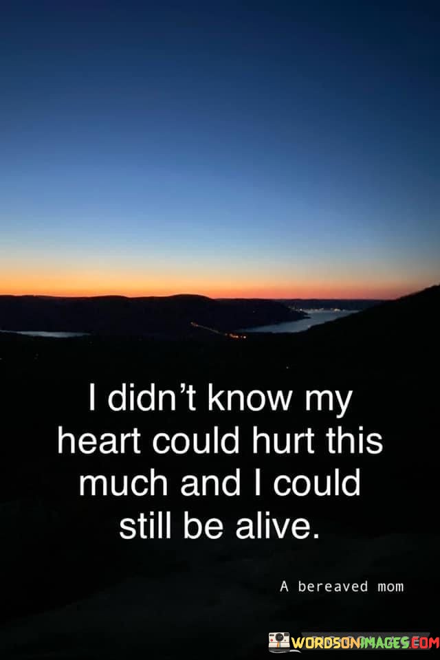 The quote reflects on the endurance of emotional pain. "Heart could hurt this much" conveys deep suffering. "Still be alive" implies resilience. The quote conveys the surprising capacity to withstand intense emotional anguish and continue living.
