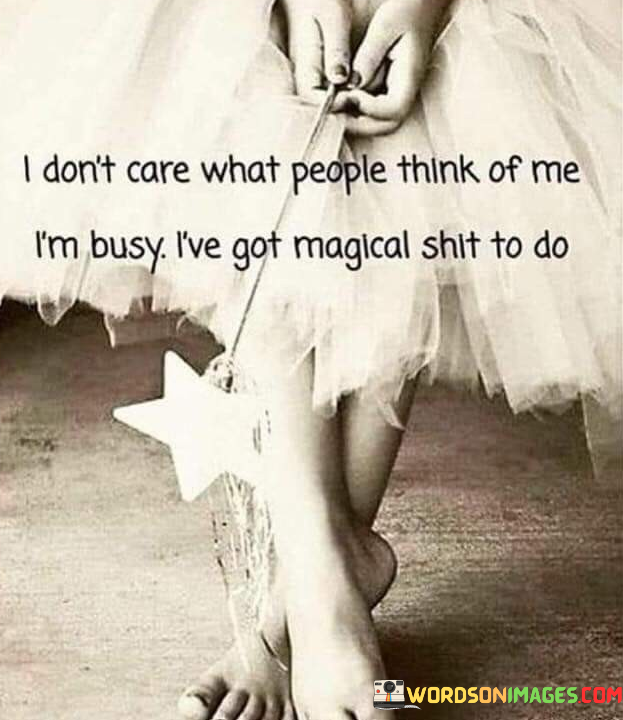 The quote reflects a confident, purposeful attitude. "Don't care what people think" signifies a self-assured demeanor. "Busy" implies a sense of focus and dedication. The quote conveys a message of prioritizing personal goals over others' opinions.
