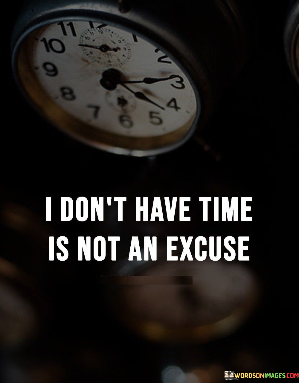 The quote "I Don't Have Time Is Not An Excuse" emphasizes that time management is a matter of priorities, not a lack of time. It challenges the common excuse of not being able to accomplish something due to a busy schedule. This quote encourages individuals to assess their activities, allocate time wisely, and take responsibility for their choices.