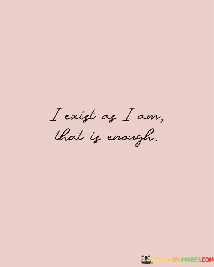 The quote "I exist as I am, that is enough" embodies the essence of self-acceptance and contentment with one's true self. It celebrates the idea that simply being who you are, without trying to conform to societal expectations or seeking external validation, is sufficient and valuable in itself. The phrase "I exist as I am" emphasizes the importance of embracing one's authentic self. It speaks to the uniqueness and individuality of each person, recognizing that we all have our own identities, experiences, and qualities that make us who we are. It encourages self-awareness and self-recognition, reminding us that our existence, with all its complexities and imperfections, is meaningful and worthy. "That is enough" highlights the idea that there is no need to strive for external validation or seek approval from others to feel complete. It rejects the notion that our worth is contingent on external factors such as appearance, achievements, or social status. Instead, it celebrates the inherent worth and value of every individual, independent of any external judgments or expectations. The quote also conveys a sense of contentment and inner peace. By accepting oneself fully, without the need to compare or compete with others, one can find a sense of fulfillment and tranquility. It encourages a shift from seeking validation from others to finding validation within oneself, fostering a sense of self-confidence and self-assurance. In a world that often pressures individuals to conform to certain standards or conform to societal norms, this quote serves as a reminder that it is okay to be different, to be true to oneself, and to embrace one's individuality. It encourages a sense of self-empowerment and self-love, reminding us that we are enough as we are. The quote can be a source of inspiration for those who may struggle with self-doubt or feelings of inadequacy. It encourages them to embrace their uniqueness and recognize the inherent value of their existence. It also serves as a powerful message to promote self-acceptance and positive self-image, helping individuals find peace and contentment within themselves. In conclusion, the quote "I exist as I am, that is enough" is a powerful affirmation of self-acceptance and self-worth. It celebrates the individuality and uniqueness of each person and encourages self-awareness and self-recognition. By embracing oneself fully and finding contentment within, it promotes a sense of inner peace and self-empowerment. This quote serves as a reminder that we are all valuable and worthy simply by being ourselves, and we don't need external validation to recognize our worth.