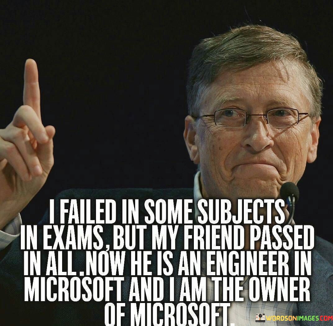 The quote "I failed in some subjects in exams, but my friend passed in all. Now he is an engineer in Microsoft, and I'm the owner of Microsoft" narrates a powerful story of resilience, determination, and the unpredictability of life's paths. It highlights that academic success does not always dictate one's future accomplishments or define their ultimate potential. The quote suggests that while the speaker may have faced academic challenges in the past, they did not let failure deter them from pursuing their dreams and aspirations. Instead of giving up or being disheartened by their academic setbacks, they used those experiences as fuel to drive them towards greater achievements. The contrast between the speaker's trajectory and their friend's illustrates that success is not solely determined by academic performance. One's journey in life can take unexpected turns, and success can be attained through different routes and opportunities. The speaker's resilience, combined with their determination to rise above academic setbacks, ultimately led them to become the owner of Microsoft, a testament to their vision, ambition, and entrepreneurial spirit. Furthermore, the quote serves as a reminder that everyone's path is unique, and comparing oneself to others' achievements is not always a fair reflection of one's potential or worth. Each individual's journey is shaped by a myriad of factors, including personal choices, experiences, and opportunities. The speaker's story demonstrates that embracing failure and using it as a catalyst for growth can lead to extraordinary achievements and success beyond expectations In conclusion, the quote "I failed in some subjects in exams, but my friend passed in all. Now he is an engineer in Microsoft, and I'm the owner of Microsoft" encapsulates the power of resilience, determination, and the unpredictability of life's journeys. It underscores that academic setbacks do not define one's potential for success. Embracing failure as a learning experience and persevering towards one's dreams can lead to remarkable achievements and opportunities. The quote inspires individuals to believe in their own abilities, chart their unique paths, and seize opportunities for growth and success.