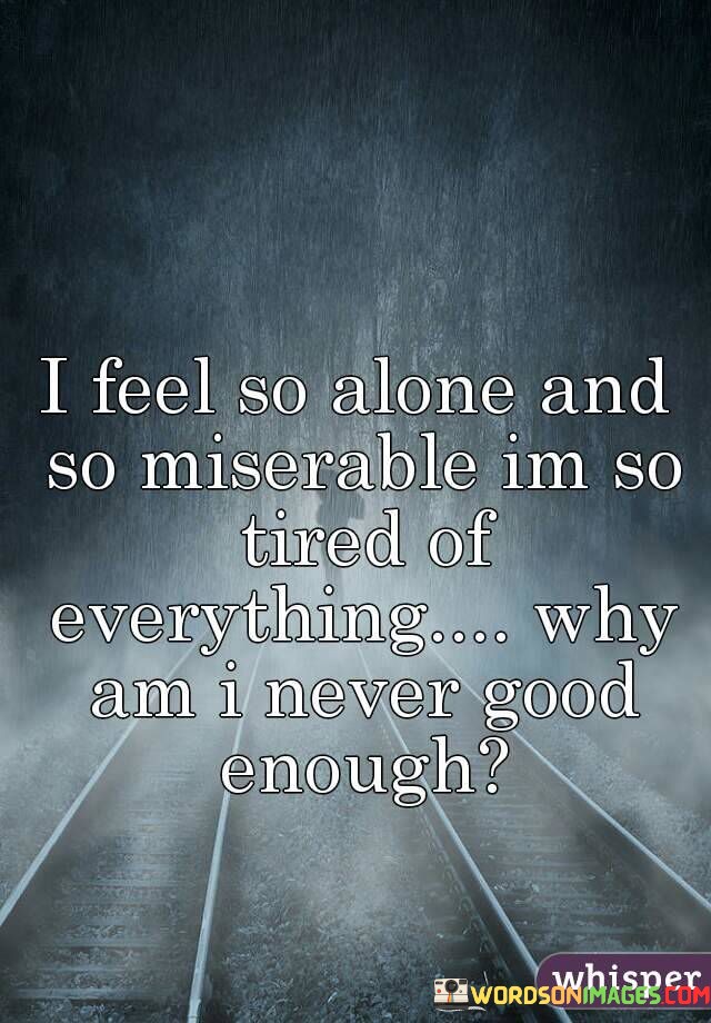 The quote conveys deep emotional distress and self-doubt. "Feel so alone and so miserable" reflects intense loneliness and unhappiness. "Tired of everything" signifies exhaustion with life's challenges. "Never good enough" represents a pervasive feeling of inadequacy. The quote illustrates the speaker's profound suffering and self-criticism.