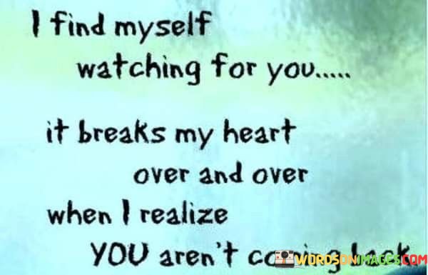 The quote conveys the persistent longing for someone's return. "Watching for you" implies anticipation. "Breaks my heart over and over" signifies recurring pain. The quote conveys the emotional toll of yearning for someone who won't return.