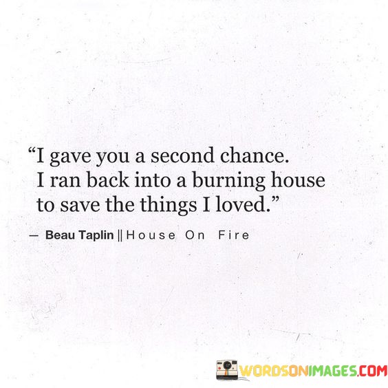 The quote reflects on the willingness to forgive and try again. "Gave you a second chance" signifies granting someone an opportunity to make amends. "Ran back into a burning house" illustrates a metaphorical risk for the sake of cherished things.