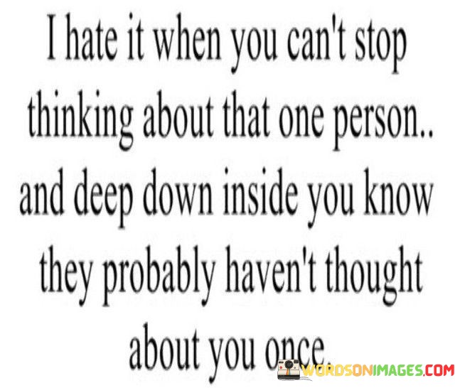 The quote, "I Hate It When You Can't Stop Thinking About That One Person and Deep Down Inside You Know They Probably Haven't Thought About You Once," captures the internal struggle of unrequited feelings. It highlights the emotional turmoil of feeling attached to someone who might not share the same sentiment.