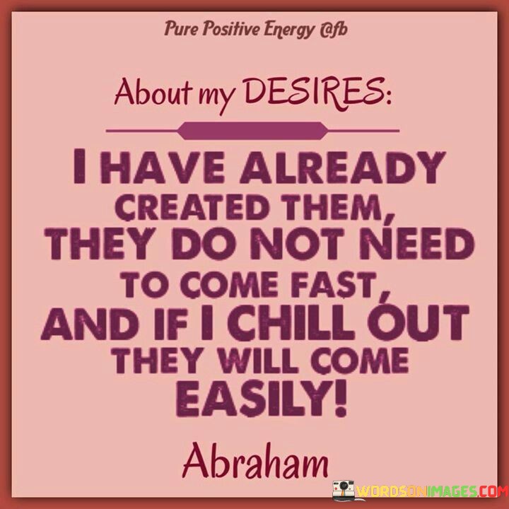 The quote conveys a sense of confidence and patience. It suggests that the speaker has already laid the foundation for their creations. It advises against rushing or forcing outcomes. Instead, the speaker believes that a relaxed and patient approach will yield better results, indicating trust in the process.
