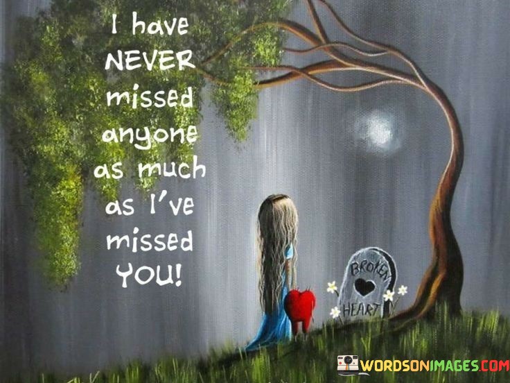 The quote conveys the depth of longing. "Never missed anyone" implies profound yearning. "Missed you" signifies emotional absence. The quote highlights an unparalleled sense of longing for the person.