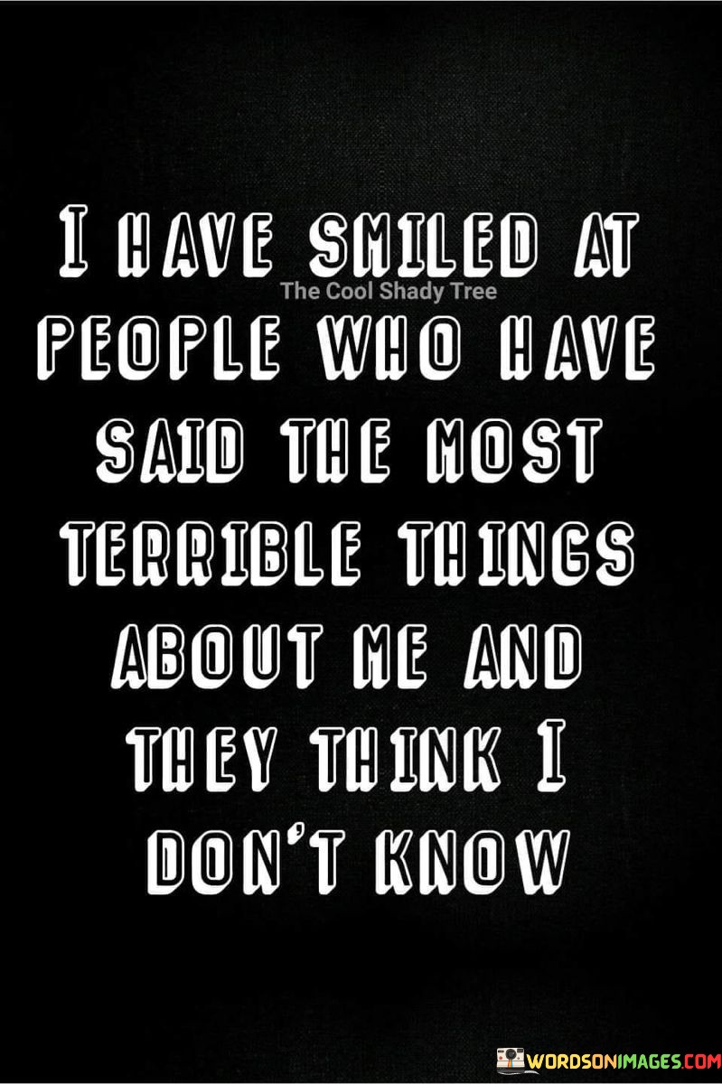 This quote reveals a resilient response to hurtful words. It describes a situation where someone responds to negativity with a smile, even when aware of hurtful comments being made behind their back.