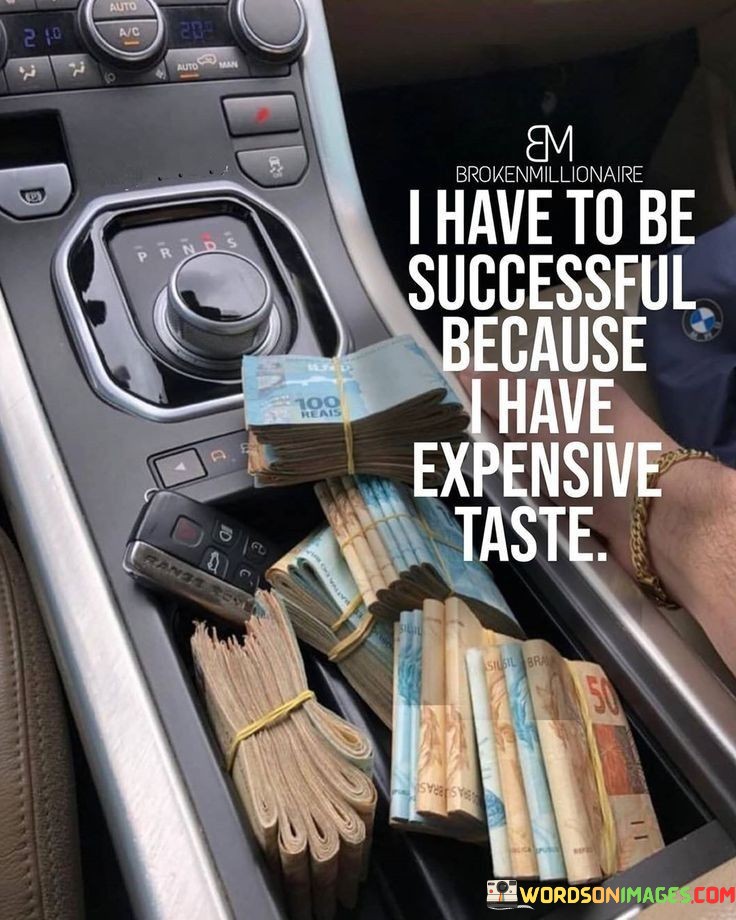 The statement humorously links success to personal preferences. It suggests that due to a taste for luxury, the individual is driven to achieve success. By playfully connecting aspirations to one's desires, the statement acknowledges the motivation that expensive tastes can provide in the pursuit of accomplishment.