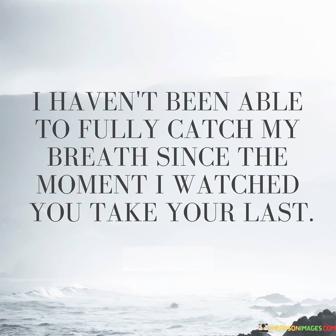 The quote expresses the enduring grief from a profound loss. "Fully catch my breath" symbolizes the continued emotional turmoil. "Watched you take your last" signifies the painful memory of witnessing the end. The quote conveys the deep and lasting impact of losing someone dear.
