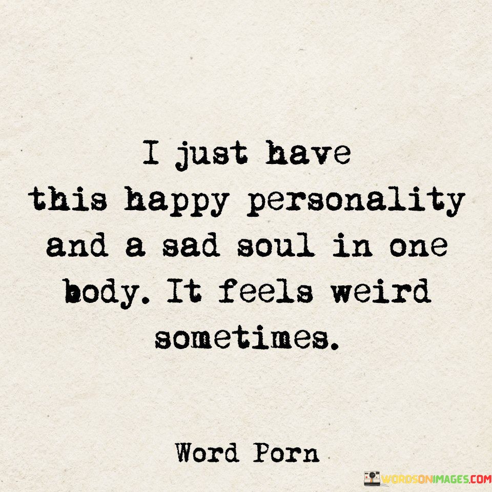 The quote reflects on the juxtaposition of outward appearance and inner emotions. "Happy personality" alludes to a cheerful demeanor. "Sad soul" implies inner turmoil. The quote conveys a sense of conflict between the external and internal aspects of the speaker's identity.