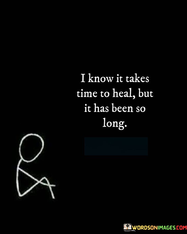 The quote "I Know It Takes Time To Heal, But It Has Been So Long" reflects the impatience and frustration that can arise from the prolonged process of healing from emotional pain or trauma. It conveys the feeling of longing for relief and recovery while grappling with the extended duration of the healing journey.