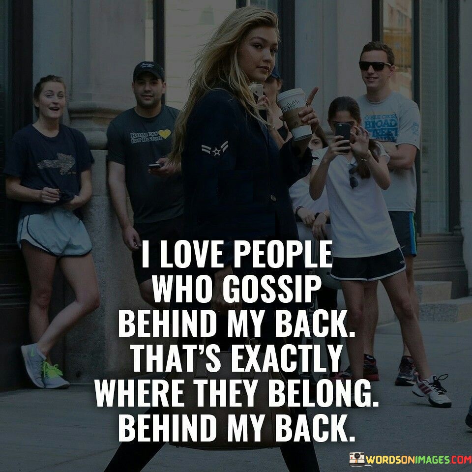 The quote addresses the idea of gossip and relationships. "I love people who gossip behind my back" acknowledges the existence of gossipers. It suggests an appreciation for those who reveal their true intentions indirectly.