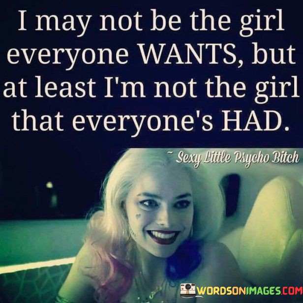 This quote reflects on the value of individuality and self-worth, highlighting the importance of embracing one's uniqueness and not measuring oneself solely based on others' opinions or comparisons. The phrase "I May Not Be The Girl Everyone Wants" acknowledges that not everyone will find you appealing or desirable, recognizing the subjectivity of preferences and tastes. However, it also suggests that seeking validation or approval from others is not the most important measure of self-worth. The quote continues with "But At Least I'm Not The Girl That Everyone's Had," emphasizing the significance of being authentic and not simply conforming to societal expectations or seeking to be someone you are not. It celebrates the idea that being true to oneself, even if it means not being universally desired, is more empowering and fulfilling than trying to fit into a mold that everyone else has already experienced. In a broader context, this quote addresses the pressure many individuals feel to meet societal standards of attractiveness or popularity. It encourages self-acceptance and self-love, emphasizing that true happiness and fulfillment come from embracing one's unique qualities and refusing to define oneself based on others' perceptions. The quote challenges the notion that being universally desired or having widespread approval is the ultimate measure of worthiness. Instead, it promotes the idea that authenticity and individuality are attributes to be cherished and celebrated. It also calls attention to the importance of recognizing one's own value and not comparing oneself to others based on external factors or superficial judgments. Ultimately, this quote serves as a reminder that the path to self-confidence and contentment lies in being genuine and embracing one's true self, regardless of external validation or the expectations of others.