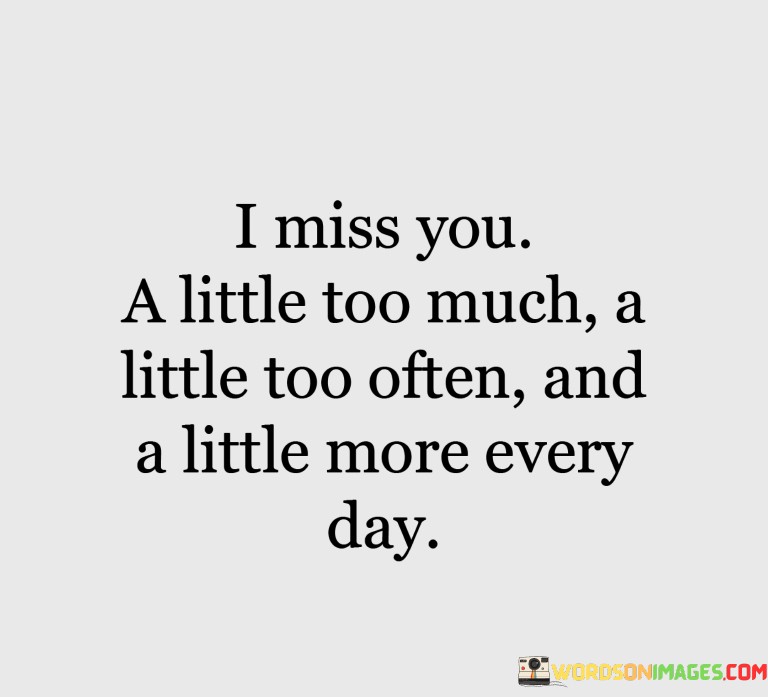 The quote, "I Miss You A Little Too Much, A Little Too Often, and a Little More Every Day," conveys the increasing weight of absence. It implies that the emotions of missing someone become more pronounced with each passing day.
