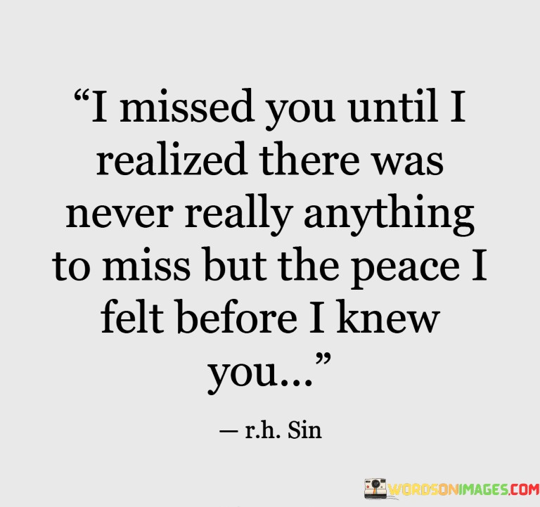 This quote, "I Missed You Until I Realized There Was Never Really Anything to Miss but the Peace I Felt Before I Knew You," encapsulates a journey of emotional revelation. At first, the speaker experiences a longing for someone's presence, yet this yearning transforms into an epiphany. The quote underscores that the essence of their longing is not the person themselves, but the tranquility they experienced prior to the relationship.