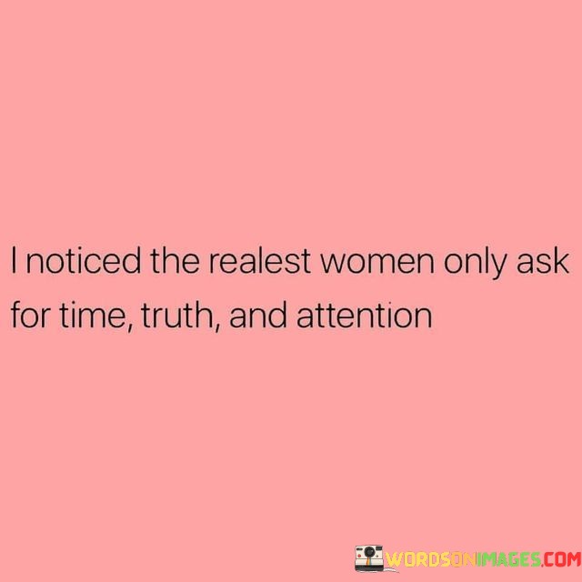 This quote highlights the qualities that the speaker believes real and genuine women prioritize in a relationship. It suggests that these women value time, truth, and attention from their partners over material possessions or extravagant gestures.