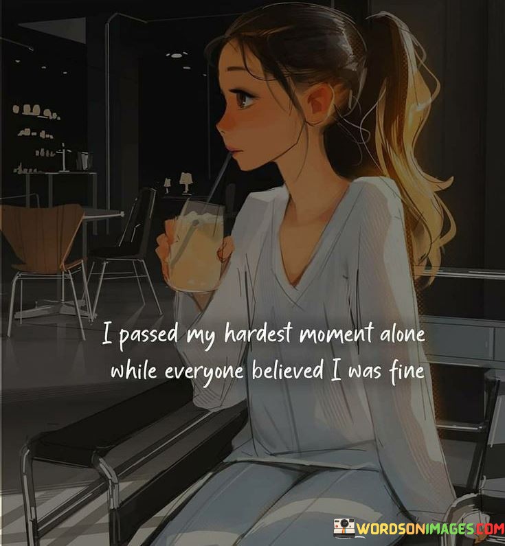 The quote "I passed my hardest moment alone; everyone believed I was fine" conveys the experience of facing difficult times in solitude while outwardly appearing composed and unaffected. It highlights the disconnect between how one might be perceived by others and the reality of their internal struggles.