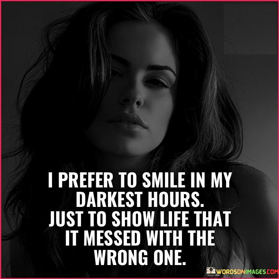This quote signifies a resilient and defiant response to challenging times. It suggests choosing to smile during difficult moments as a way to demonstrate strength and determination in the face of adversity.