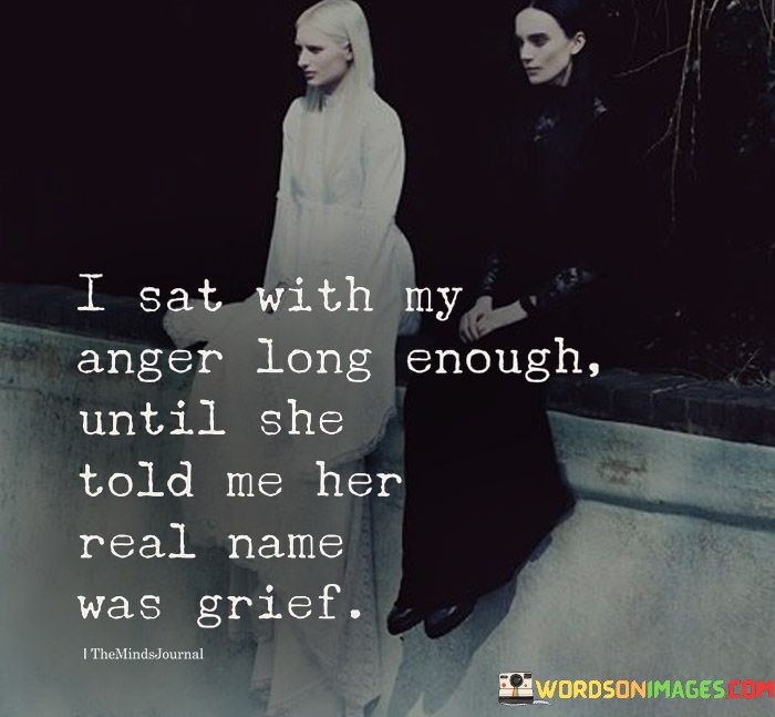 The quote "I Sat With My Anger Long Enough Until She Told Me Her Real Name Was Grief" delves into the depth of human emotions and the transformative power of introspection and self-awareness. At first glance, the quote speaks about the speaker's experience with anger, suggesting that they took the time to truly understand and confront their feelings of anger. However, upon deeper reflection, the quote reveals a profound revelation—the true nature of the emotion was not anger, but rather grief. This realization illustrates the interconnectedness of emotions and the complexity of human experiences.The use of personification, giving the emotion of anger a voice and identity, adds depth to the quote. It conveys the idea that emotions are not isolated or singular; they can be intertwined and interconnected. By sitting with their anger, the speaker allowed themselves the opportunity for self-discovery, leading them to uncover the underlying emotion of grief, which may have been concealed or suppressed beneath the surface.The quote also reflects the importance of allowing oneself to experience and process emotions fully. Instead of reacting impulsively to anger, the speaker chose to sit with it, giving it space and attention. This act of introspection and self-reflection allowed them to understand the root cause of their feelings and come to terms with their grief. It speaks to the healing power of acknowledging and embracing one's emotions, ultimately leading to a deeper understanding of oneself and personal growth.In essence, "I Sat With My Anger Long Enough Until She Told Me Her Real Name Was Grief" conveys a message of emotional intelligence and self-awareness. It encourages individuals to explore their feelings with patience and compassion, recognizing that emotions can often be layered and multifaceted. By taking the time to listen to our emotions and understanding their true nature, we can gain insights into our inner selves, paving the way for healing and growth. The quote reminds us of the intricacies of human emotions and the transformative potential of embracing our feelings with courage and curiosity.