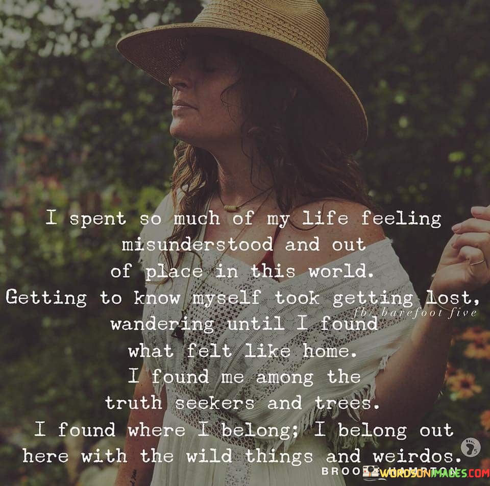 The quote "I spent so much of my life feeling misunderstood and out of place in this world. Getting to know myself took getting lost, wandering until I found what felt like home. I found me among the truth seekers and trees. I found where I belong. I belong out here with the wild things and weirdos" expresses a powerful journey of self-discovery and acceptance. The speaker reflects on a significant part of their life when they felt disconnected from the world around them, struggling with a sense of not belonging. However, instead of conforming to societal norms, they embarked on a soul-searching journey, wandering and exploring until they discovered a sense of belonging among like-minded individuals—those who seek truth and authenticity, and in the company of nature.The quote highlights the profound impact of finding one's true self by embracing uniqueness and individuality. It speaks to the healing power of self-discovery, which enabled the speaker to uncover their authentic identity, free from the constraints of societal expectations. The metaphor of "getting lost" suggests that sometimes, in order to truly find ourselves, we must venture into the unknown and challenge our perceptions and beliefs. In essence, "I spent so much of my life feeling misunderstood and out of place in this world. Getting to know myself took getting lost, wandering until I found what felt like home. I found me among the truth seekers and trees. I found where I belong. I belong out here with the wild things and weirdos" is a heartfelt testimony to the power of self-exploration, the healing nature of finding one's tribe, and the liberation of embracing one's authentic self. It is a celebration of individuality, urging others to embrace their unique journey of self-discovery and find their place among kindred spirits and the wonders of nature.