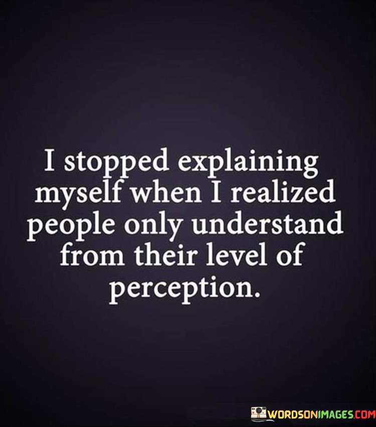 This quote reflects the realization that attempting to explain oneself to others can be futile, as people's understanding is often limited by their own perspectives. In the first paragraph, the quote's essence can be captured by highlighting the frustration that arises from trying to make others comprehend our thoughts and feelings. It conveys the idea that people's comprehension is filtered through their own experiences and biases.