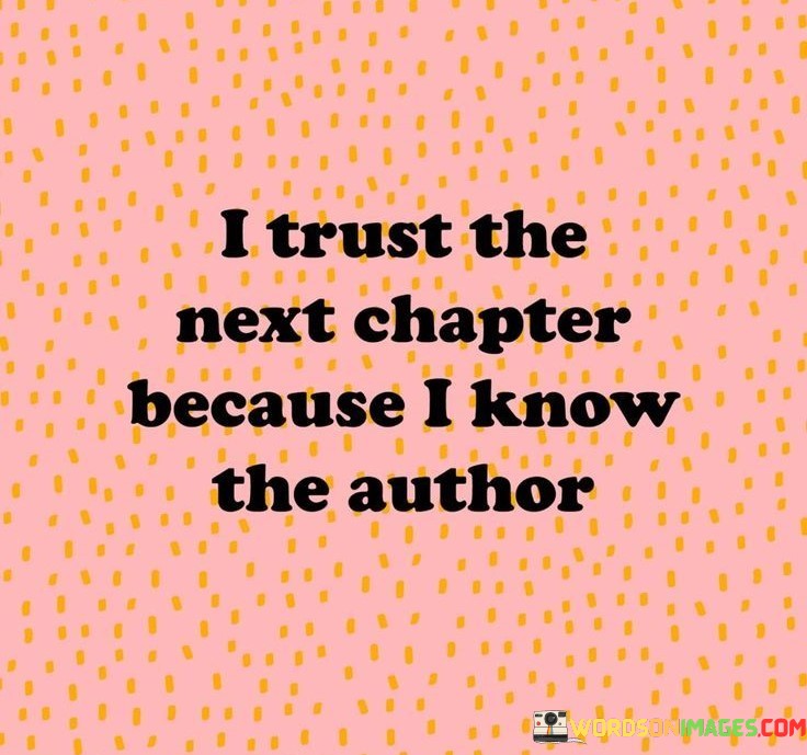 This quote reflects a positive and hopeful outlook on life, expressing trust and confidence in the future. By stating, "I trust the next chapter because I know the author," the quote implies that the individual has faith in their own abilities and self-determination to shape their life's journey.