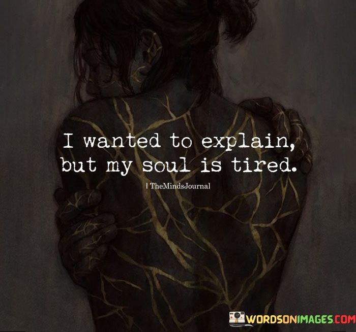 In this quote, the speaker conveys a profound sense of exhaustion and weariness that goes beyond physical fatigue. In the first paragraph, it highlights a deep desire to communicate and explain something, suggesting an inner turmoil or emotional burden. However, the key point is the soul's weariness, implying that the emotional and mental toll has become overwhelming.