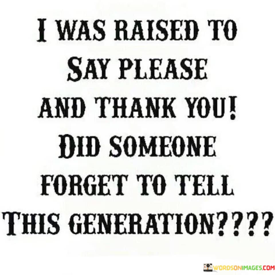 This observation highlights a perceived shift in manners and etiquette. "I was raised to say please and thank you; did someone forget to tell this generation?" suggests a comparison between the speaker's upbringing and the behavior of the current generation. It underscores the transformative power of politeness and respectful communication.