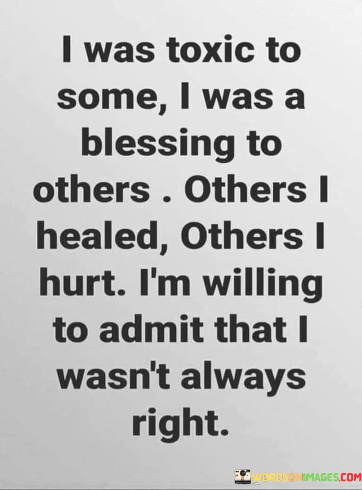 This quote reflects on the complex nature of one's impact on others and personal growth. "Toxic to some, a blessing to others" illustrates the duality of human interactions. It acknowledges that people may have differing experiences with us, and our actions can have both positive and negative consequences.