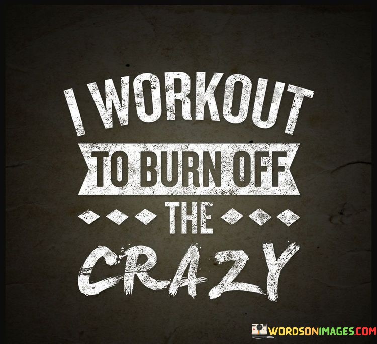The quote "I workout to burn off the crazy" expresses a metaphorical sentiment about the therapeutic and stress-relieving effects of physical activity. It suggests that engaging in exercise helps to alleviate feelings of anxiety, stress, and mental turmoil by providing a productive outlet for emotions and energy.
