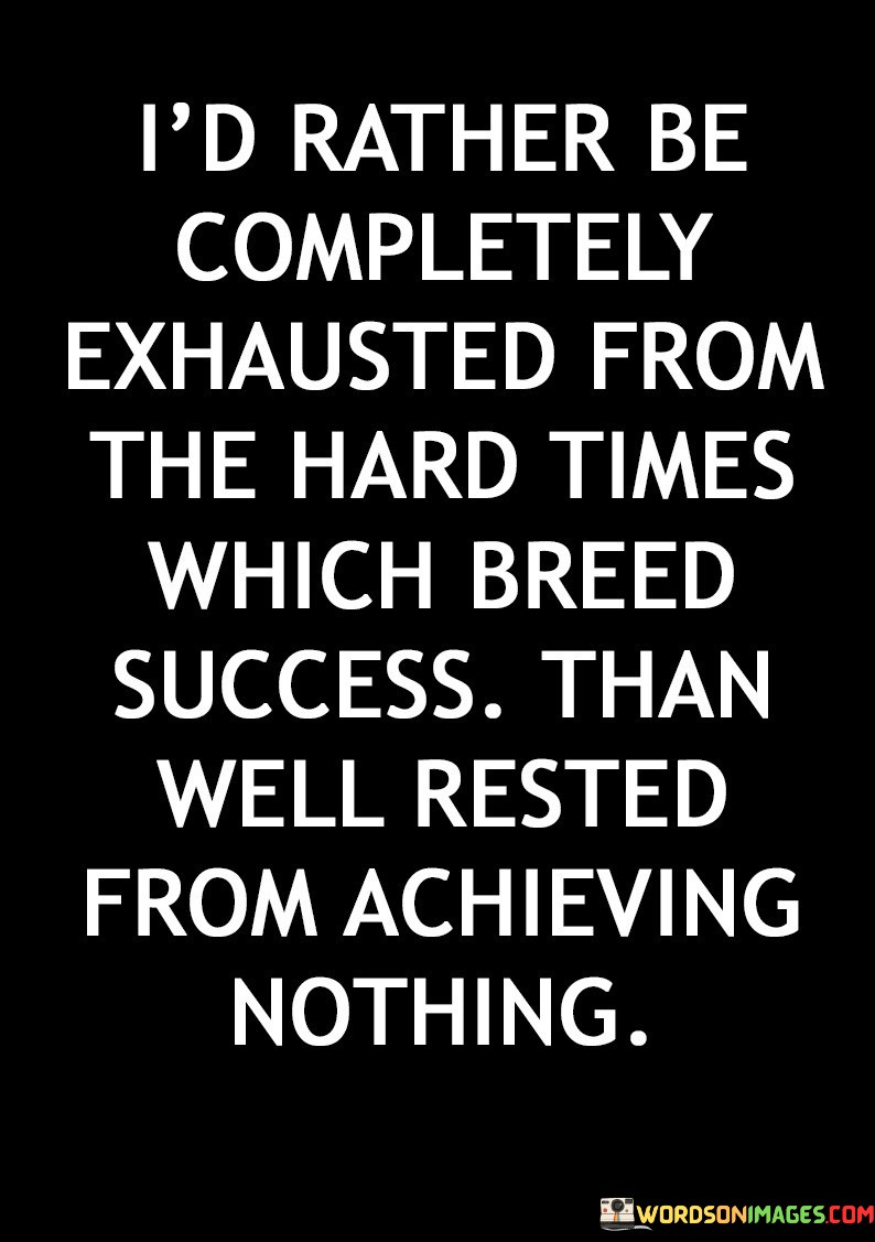 "I'd Rather Be Completely Exhausted from the Hard Times Which Breed Success Than Well Rested from Achieving Nothing": This statement emphasizes the value of enduring challenges and exerting effort in the pursuit of meaningful accomplishments.