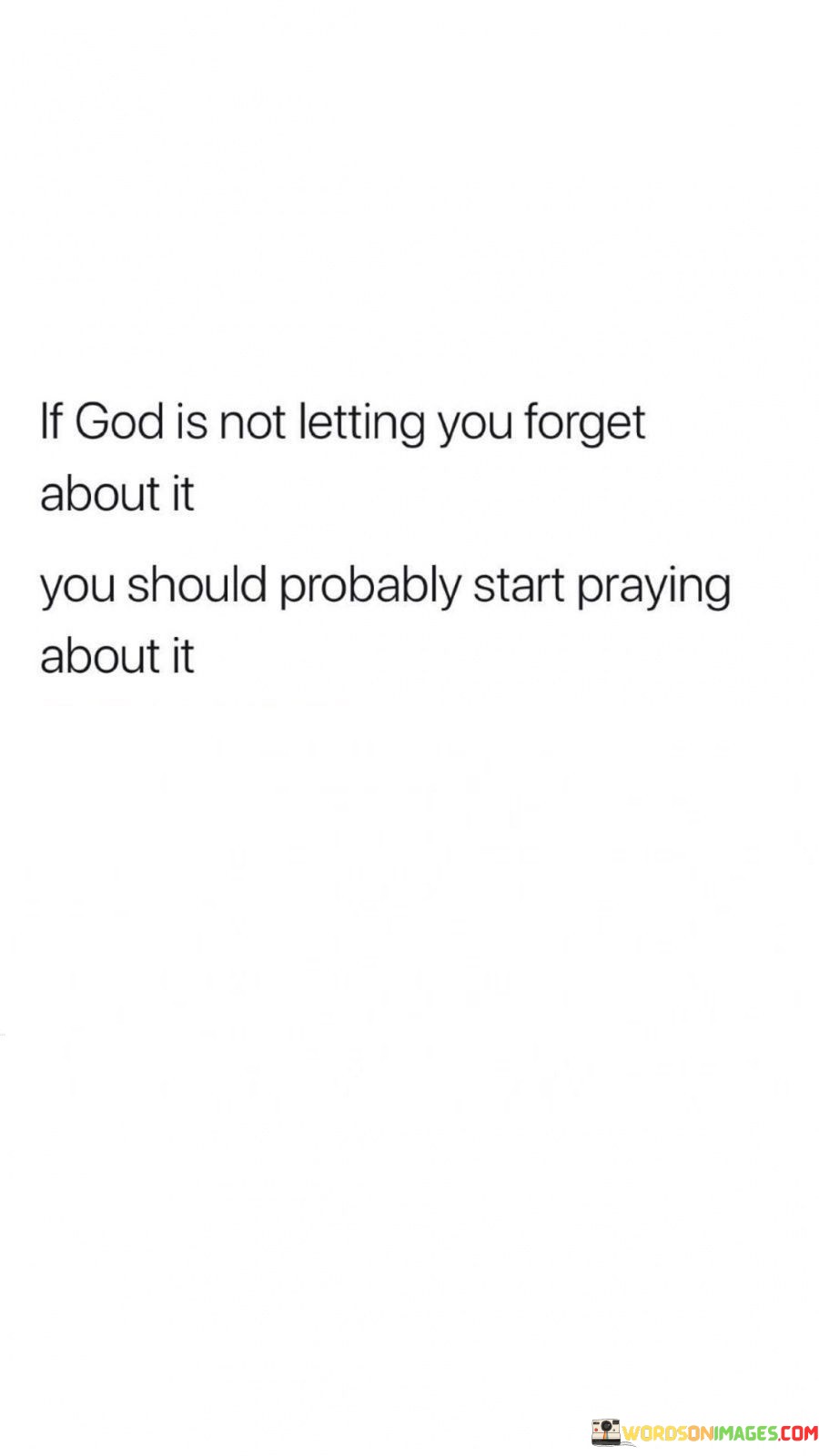 The quote "If God Is Not Letting You Forget About It, You Should Probably Start Praying About It" conveys a message of divine prompting and the importance of recognizing signs from a higher power. It suggests that when a particular issue or concern repeatedly occupies one's thoughts and heart, it may be a signal from God to turn to prayer for guidance and resolution.