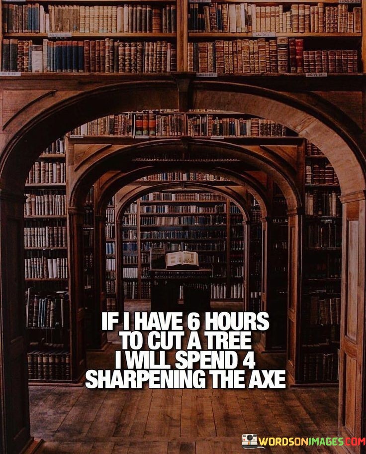 This quote emphasizes the value of preparation and planning before undertaking a task. It suggests that investing time in sharpening the tools beforehand can significantly improve the efficiency and effectiveness of completing the task itself.