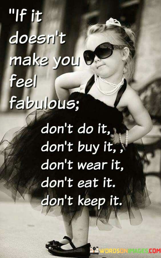 This quote emphasizes the importance of prioritizing self-care and personal happiness. The phrase "if it doesn't make you feel fabulous" serves as a guiding principle, urging individuals to evaluate their choices based on how they make them feel.
