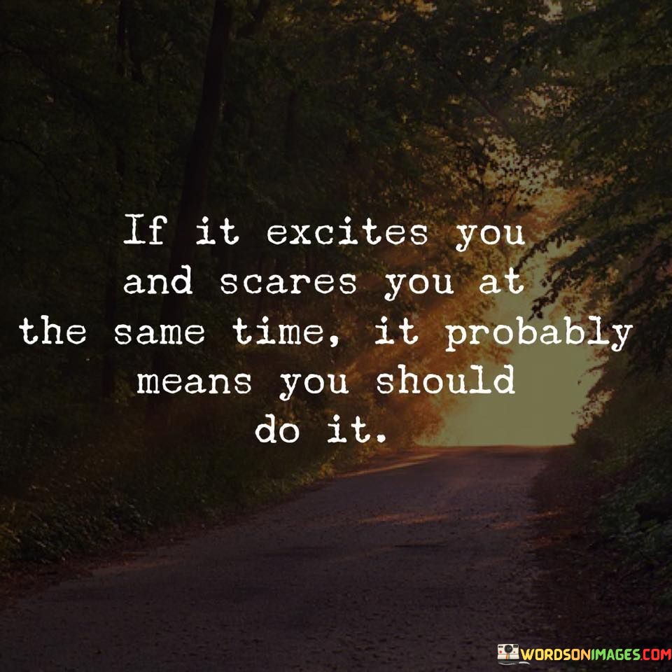 The statement promotes courage and personal expansion. "Excites You And Scares You" implies growth potential. "It Probably Means You Should Do It" underscores the transformative nature of experiences that push boundaries.
