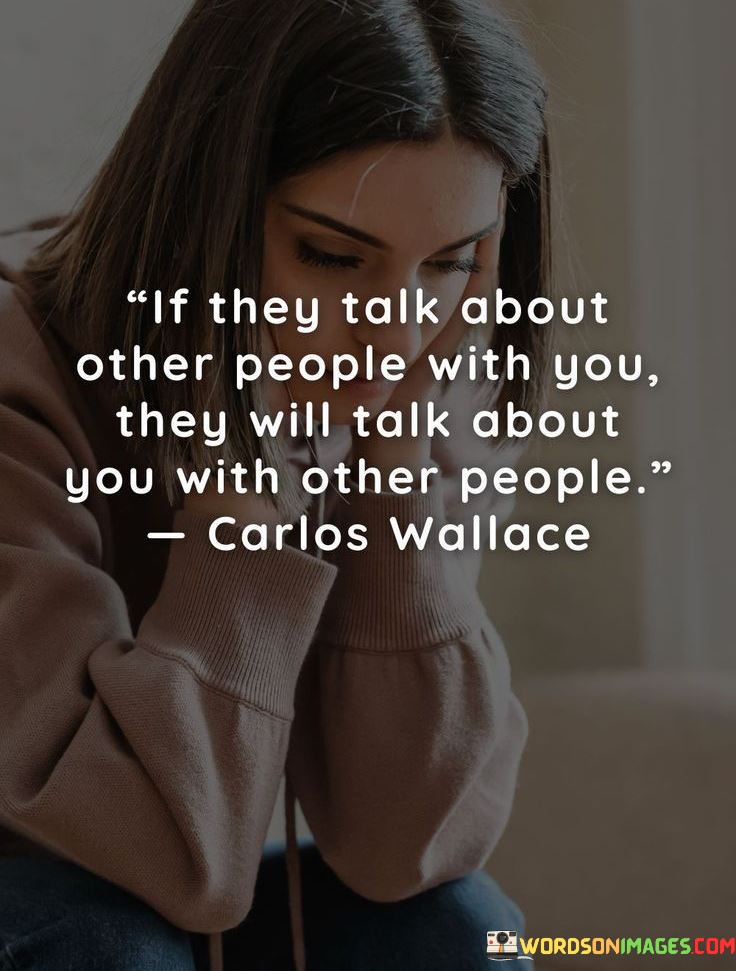 The quote suggests that if someone engages in gossip or negative discussions about others in your presence, they are likely to do the same about you when you're not around. It implies a correlation between their behavior and their potential actions towards you.