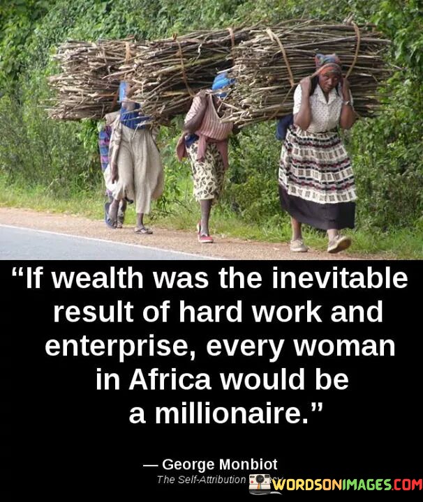 This quote addresses the complex issue of wealth inequality and highlights the disparity between hard work, entrepreneurship, and economic outcomes, particularly in the context of Africa. The phrase "If Wealth Was The Inevitable Result Of Hard Work And Enterprise" implies that, in an ideal world, individual effort and entrepreneurship would always lead to financial success. However, the quote challenges this notion by pointing out that despite the hard work and ingenuity of many women in Africa, not everyone has achieved wealth or economic prosperity. The statement "every woman in Africa would be a millionaire" serves as a poignant metaphor, highlighting the systemic barriers and structural challenges that hinder economic progress for women in the continent. It underscores the reality that economic success is influenced by a multitude of factors beyond hard work, including access to resources, education, financial opportunities, and institutional support. In a broader context, this quote sheds light on the complexity of wealth distribution and economic opportunities, particularly in regions with historical and systemic economic disparities like Africa. It brings attention to the barriers that many women face in accessing financial resources and opportunities, despite their hard work and entrepreneurial efforts. The quote serves as a call to address the underlying systemic issues that perpetuate wealth inequality and hinder economic mobility for women in Africa. It encourages policymakers, institutions, and societies to recognize the importance of providing equal access to education, finance, and entrepreneurial support for women to thrive economically. Moreover, it advocates for a more inclusive and equitable economic system that considers the diverse challenges faced by women in Africa and works towards breaking down the barriers that prevent them from realizing their full potential. Ultimately, this quote urges us to reflect on the broader economic landscape and strive for a future where economic success is not determined solely by hard work, but where all individuals have an equal opportunity to prosper and thrive.