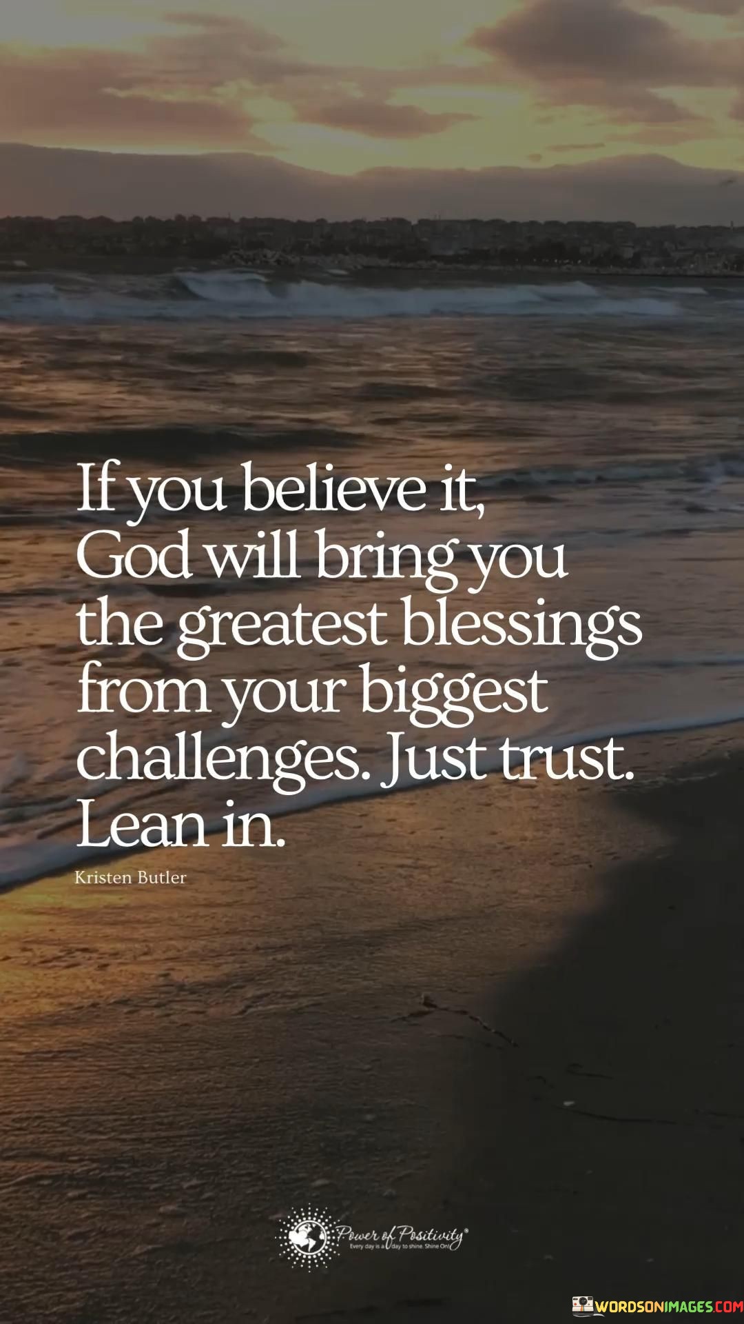 The quote "If you believe it, God will bring you the greatest blessings from your biggest challenges, just trust, lean in" conveys a message of faith, resilience, and trust in a higher power, often symbolized as God. It suggests that when faced with significant challenges or obstacles in life, believing in God's plan and trusting in His guidance can lead to transformative blessings and growth.